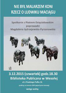 Biblioteka Publiczna w Wesołej przy ul. 1 Praskiego Pułku 31 zaprasza 3 grudnia o godz.18.30 na spotkanie autorskie z Piotrem Dzięciołowskim wokół książki "Nie był malarzem koni" będącej wspomnieniem o wybitnym polskim artyście, mieszkańcu Wesołej Ludwiku Maciągu. Wstęp wolny.