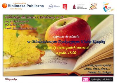 15 stycznia o godz. 18:00 zapraszamy do Biblioteki dla Dzieci i Młodzieży nr 36 przy ul. Redutowej 48 naspotkanie Młodzieżowego Dyskusyjnego Klubu Książki.