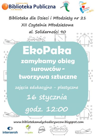 16 stycznia o godz. 12:00 zapraszamy do Biblioteki dla Dzieci i Młodzieży nr 21 przy al. Solidarności 90 na zajęcia edukacyjne poświęcone ekologii pt. „Tworzywa sztuczne”.