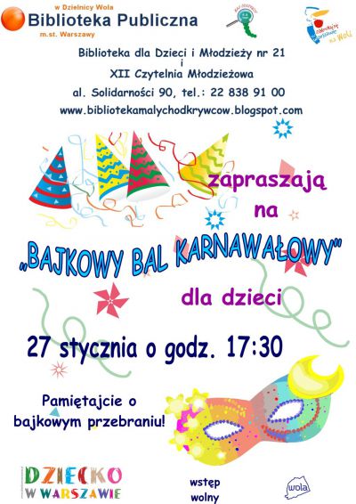 Karnawał to czas zabaw, maskarad oraz wielkich balów… dlatego 27 stycznia Biblioteka dla Dzieci i Młodzieży nr 21 przy al. Solidarności 90 zaprasza wszystkie dzieci wraz z opiekunami naBajkowy Bal Karnawałowy.