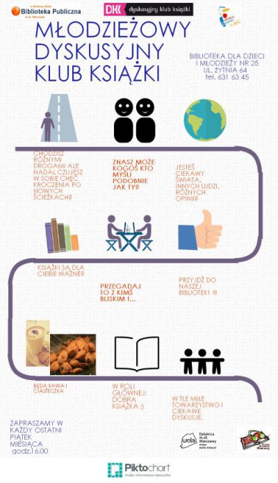 29 stycznia o godz. 16:00 zapraszamy do Biblioteki dla Dzieci i Młodzieży nr 25 przy ul. Żytniej 64 na spotkanie Młodzieżowego Dyskusyjnego Klubu Książki. | JESTEŚ ORGANIZATOREM WYDARZEŃ? DODAJ WYDARZENIE TUTAJ |